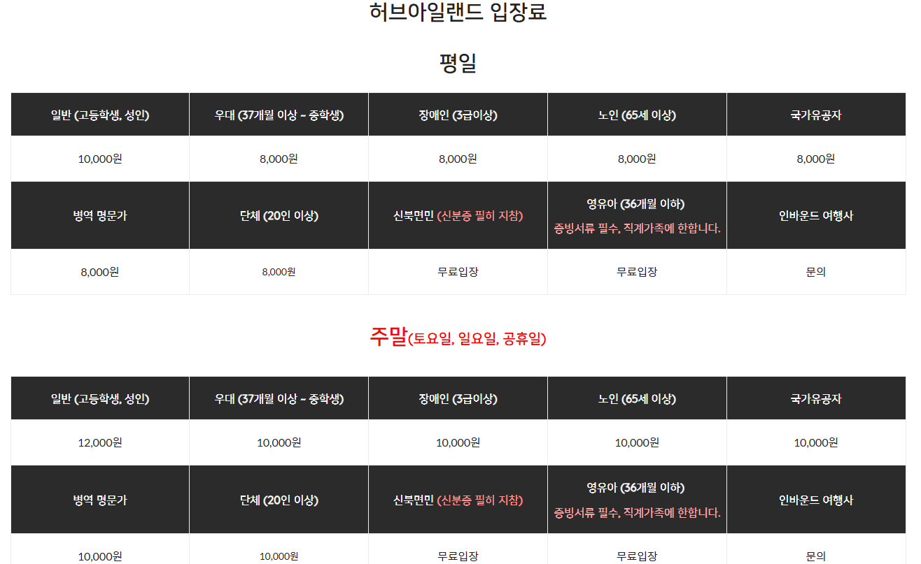 - 허브아일랜드는 입장료가 추가로 필요.