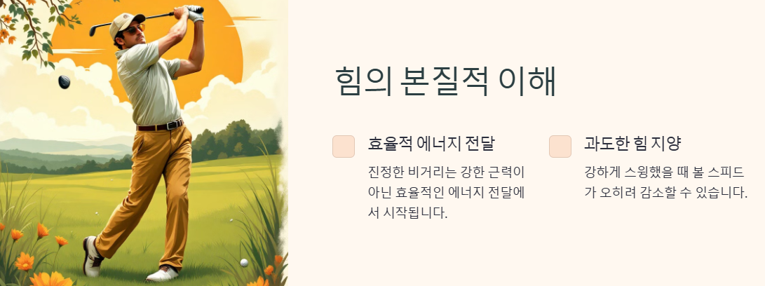 골프에서 진정한 비거리는 강한 근력이 아니라 효율적인 에너지 전달에서 시작됩니다. 많은 골퍼들이 흔히 저지르는 실수는 과도한 힘을 주입하는 것입니다. 실제로, 강하게 스윙했을 때 볼 스피드가 오히려 감소하는 역설적인 경험을 많은 골퍼들이 겪었을 것입니다.