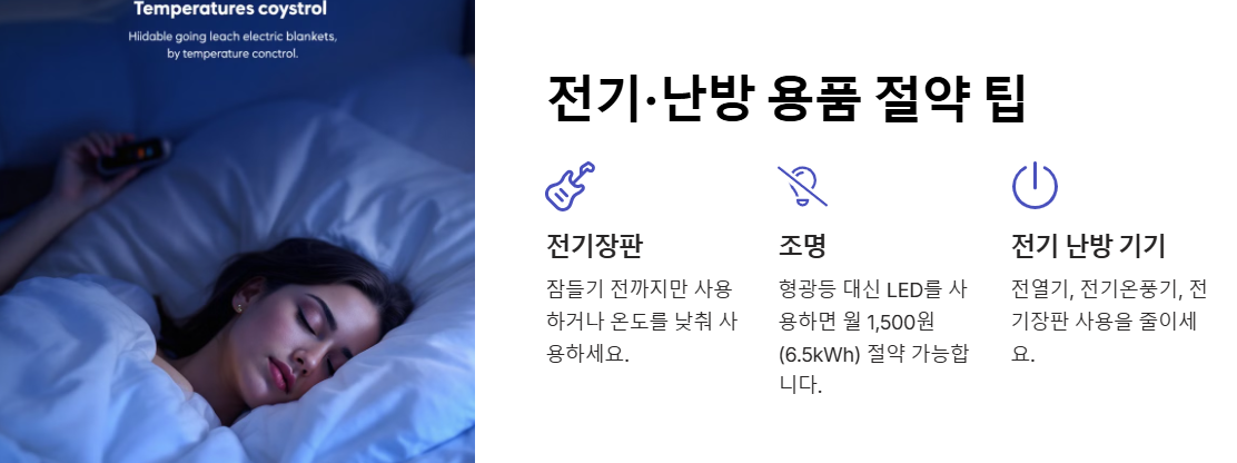 전기장판은 겨울철 필수품이지만, 전기요금이 많이 나올 수 있어요. 잠들기 전까지만 사용하거나, 온도를 한 단계만 낮춰도 매월 1,760원을 아낄 수 있답니다.