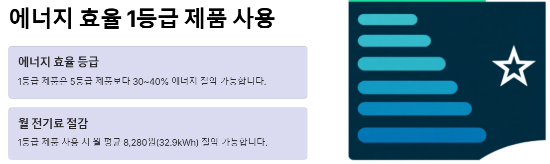 가전제품을 구매할 때 에너지소비효율등급을 꼭 확인하세요. 1등급 제품은 5등급 제품보다 30~40% 정도 에너지를 덜 사용한답니다. 4인 가구 기준으로 1등급 제품을 사용하면 매월 8,280원을 절약할 수 있어요.
