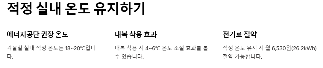 겨울철 실내 적정온도는 18 ~ 20도라고 합니다. 우리 몸에 가장 좋은 온도가 23~24도인데, 왜 20도를 권장할까요? 비결은 바로 '내복'입니다. 내복과 실내복을 함께 입으면 체감온도가 4~6도 정도 올라가기 때문이에요. 즉, 실내온도가 20도여도 내복을 입으면 24도처럼 따뜻하게 느낄 수 있답니다. 이렇게 적정온도만 잘 지켜도 매월 6,530원을 아낄 수 있어요.