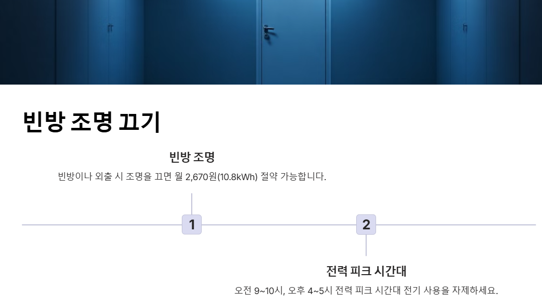 조명은 LED를 사용하면 매월 1,500원, 전기 난방기기 사용을 조금만 줄여도 760원이 절약됩니다. 빈 방의 불을 끄면 2,670원, 전기 사용이 많은 시간대(오전 9~10시, 오후 4~5시)를 피해서 사용하면 210원을 더 아낄 수 있어요.