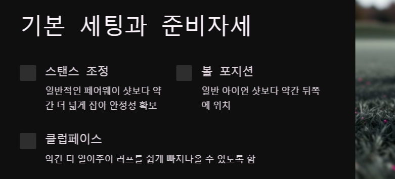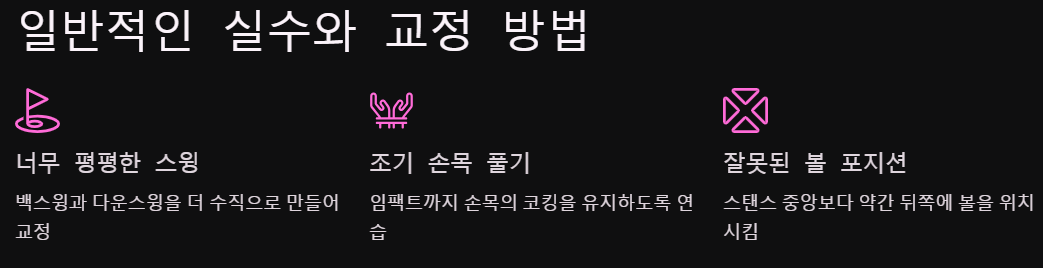 - 해결: 스탠스 중앙보다 약간 뒤쪽에 볼을 위치시킵니다