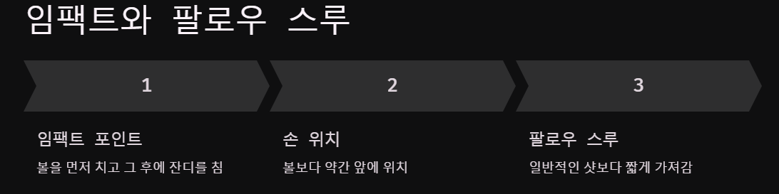 임팩트 시에는 볼을 먼저 치고 그 후에 잔디를 치는 것이 중요합니다. 이를 위해서는 손이 볼보다 약간 앞에 위치해야 합니다. 임팩트 순간에 손목의 코킹을 유지하는 것도 중요합니다. 이는 클럽페이스의 안정성을 유지하는 데 도움이 됩니다.