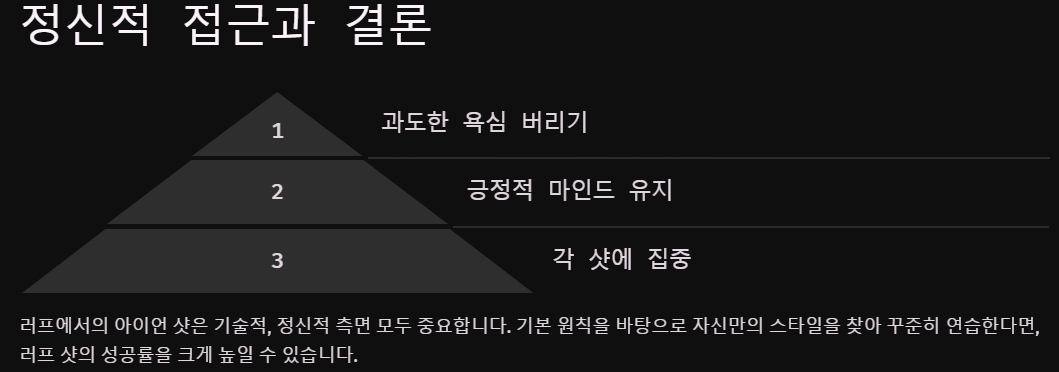 둘째, 긍정적인 마인드를 유지해야 합니다. 러프는 어려운 상황이지만, 적절한 기술과 전략으로 충분히 극복할 수 있습니다.