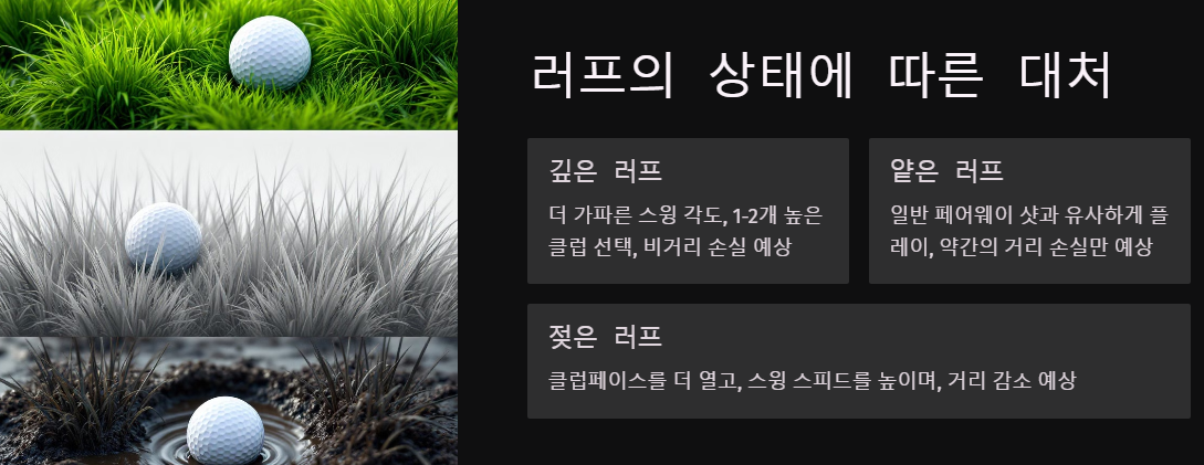 러프의 상태는 매우 다양할 수 있습니다. 깊은 러프, 얕은 러프, 젖은 러프 등 상황에 따라 다른 접근이 필요합니다.