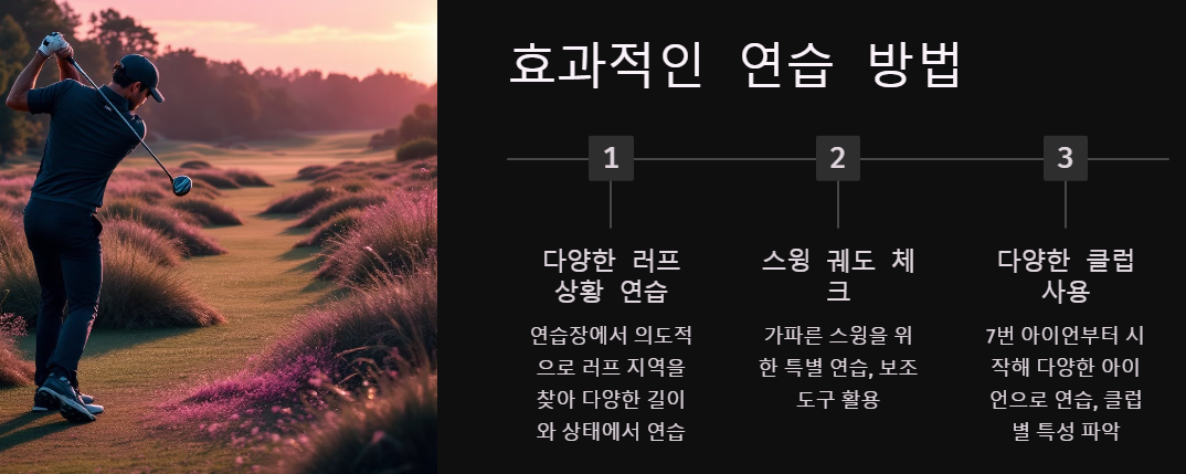 첫째, 다양한 러프 상황에서의 연습이 필요합니다. 연습장에서 의도적으로 러프 지역을 찾아 연습하세요. 다양한 러프의 길이와 상태에서 연습하면서 각각의 상황에 맞는 최적의 타격 방법을 찾아야 합니다.
