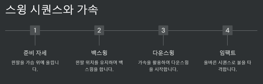 - 우측 손으로 점진적인 가속을 주입하여 스윙의 시퀀스를 조절합니다.