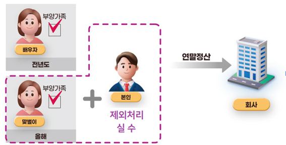 - 회사 연말정산 시스템에서 배우자가 부양가족 공제 대상으로 기본값 설정되어 있는 것을 올해 실수로 제외하지 못하고 부양가족 공제를 받으면서 이과장이 지출한 보험료·기부금·신용카드 사용금액도 모두 공제받았음