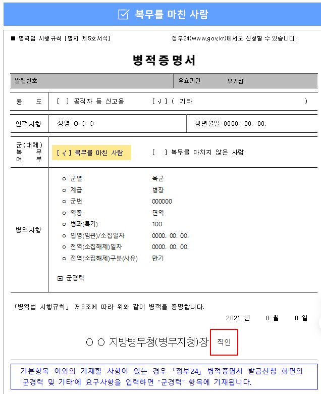 A. 네, 병무청 누리집에서 ‘병적증명서’를 발급받아 사용 가능합니다.