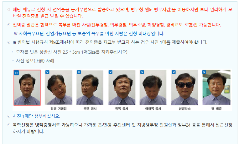- 수수료 결제: 전역증 재발급에는 소정의 수수료가 부과될 수 있습니다. 온라인 결제 시스템을 통해 수수료를 결제합니다.